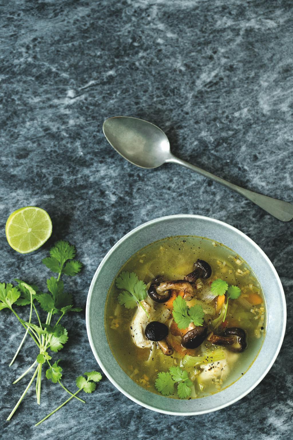 Asiatisk kyllingesuppe med porrer og stegte svampe