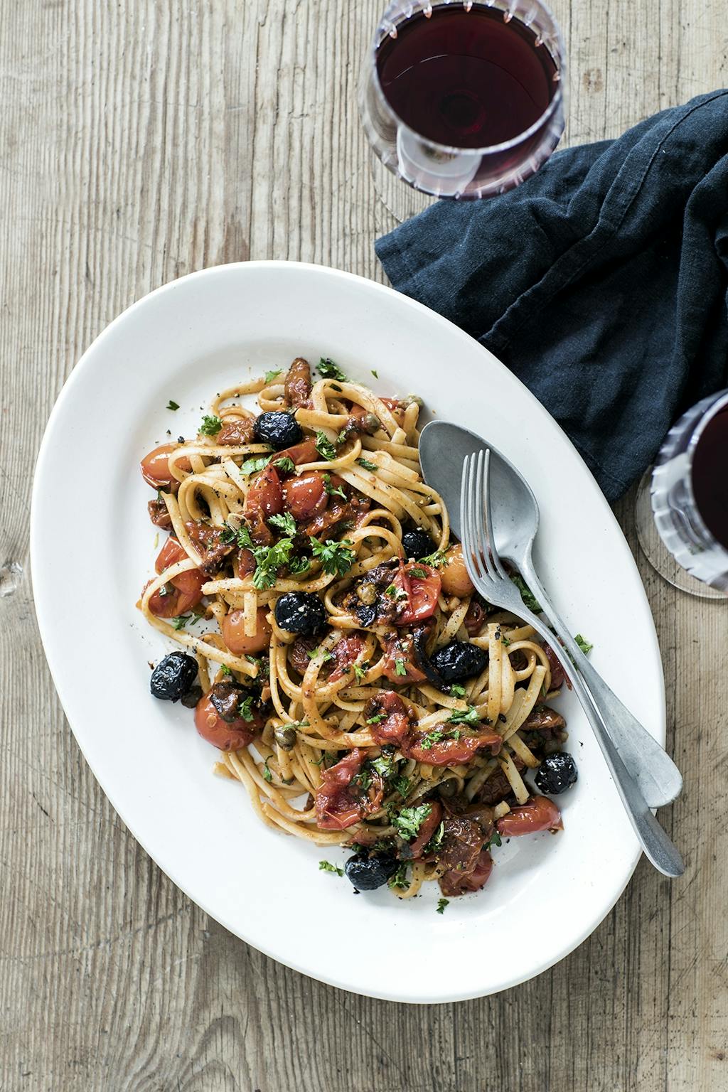 Puttanesca med ansjoser, oliven, kapers og kruspersille